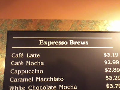 Then there was this oh-so-common misspelling which is fine if you’re looking for fast coffee or want to be laughed at by the Italians: